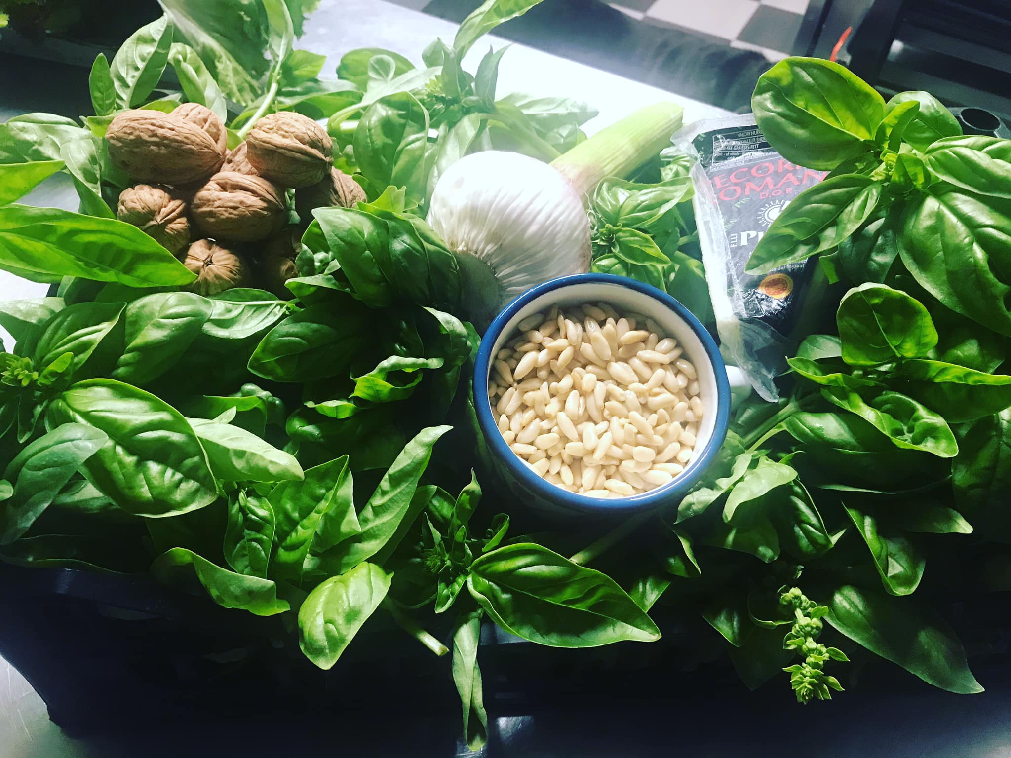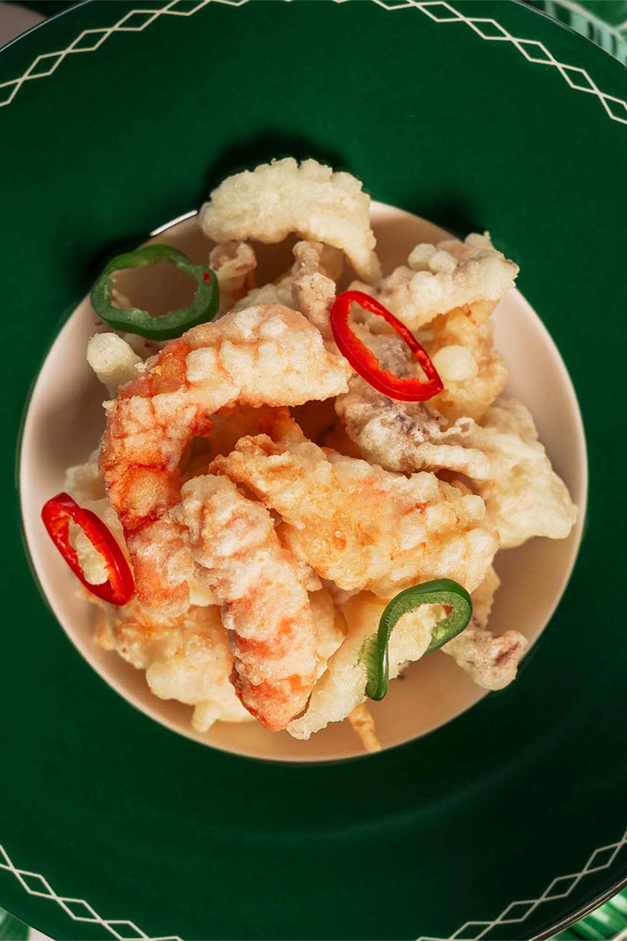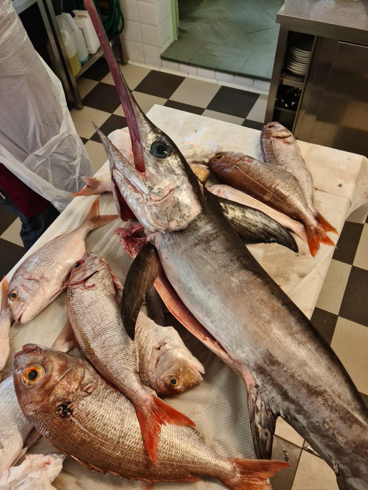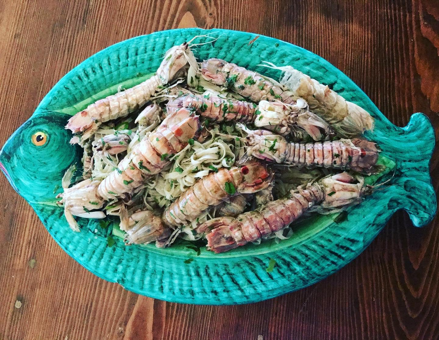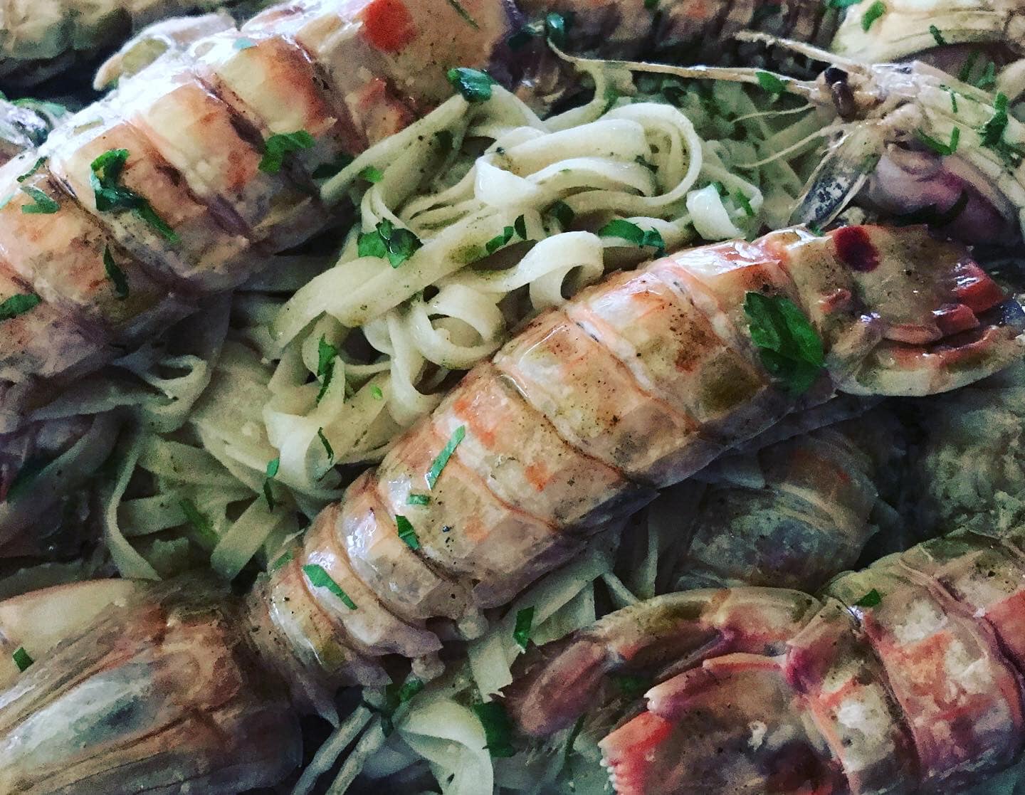 Mixed fried fish, Red prawns, Pesto pasta, Arselle x2. -