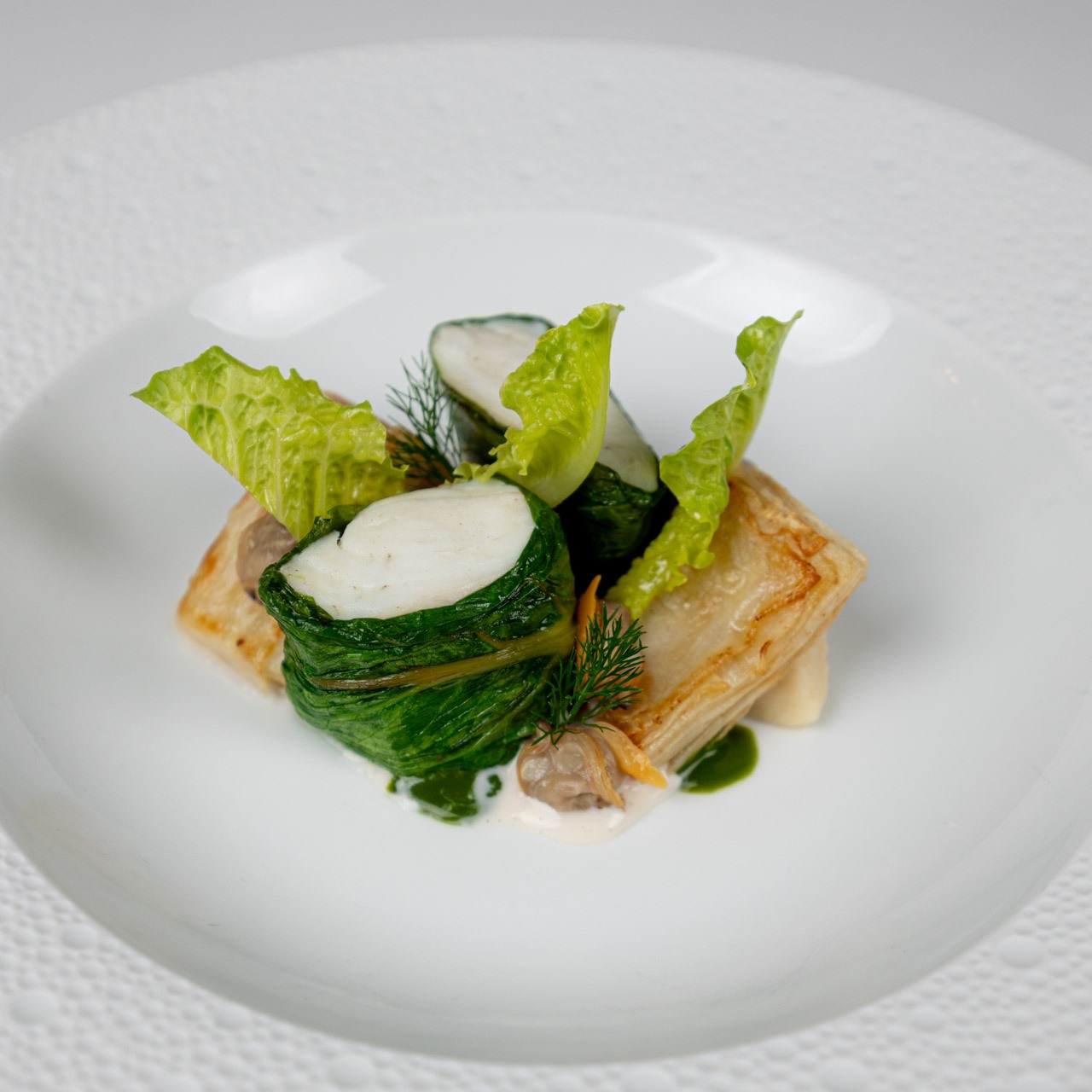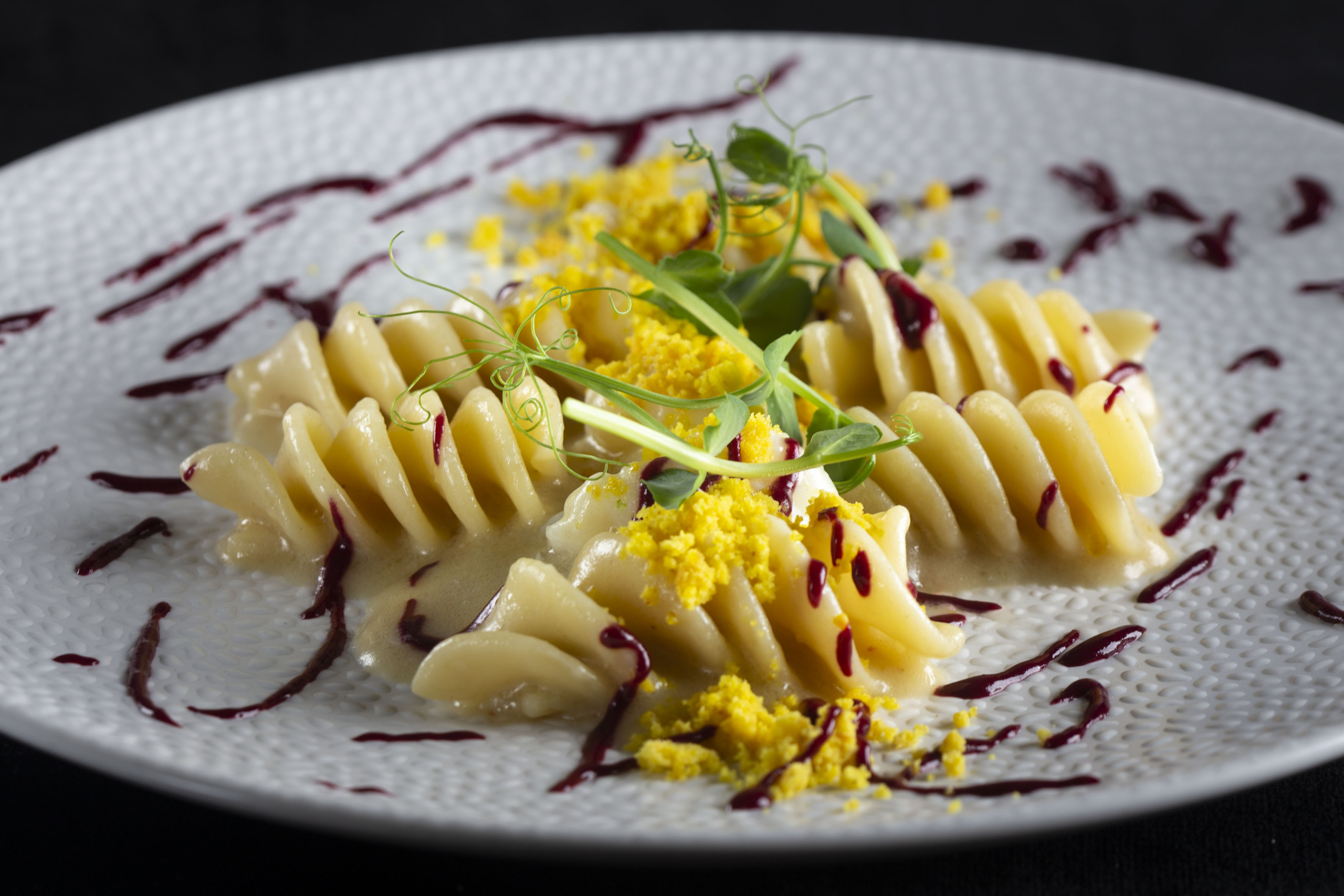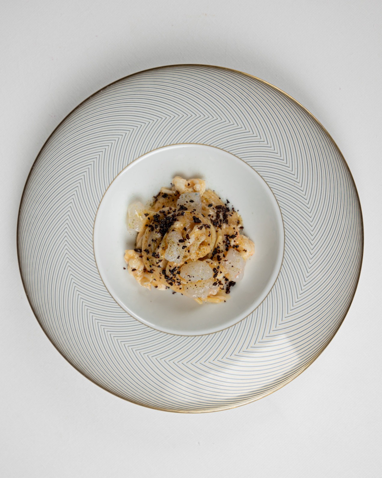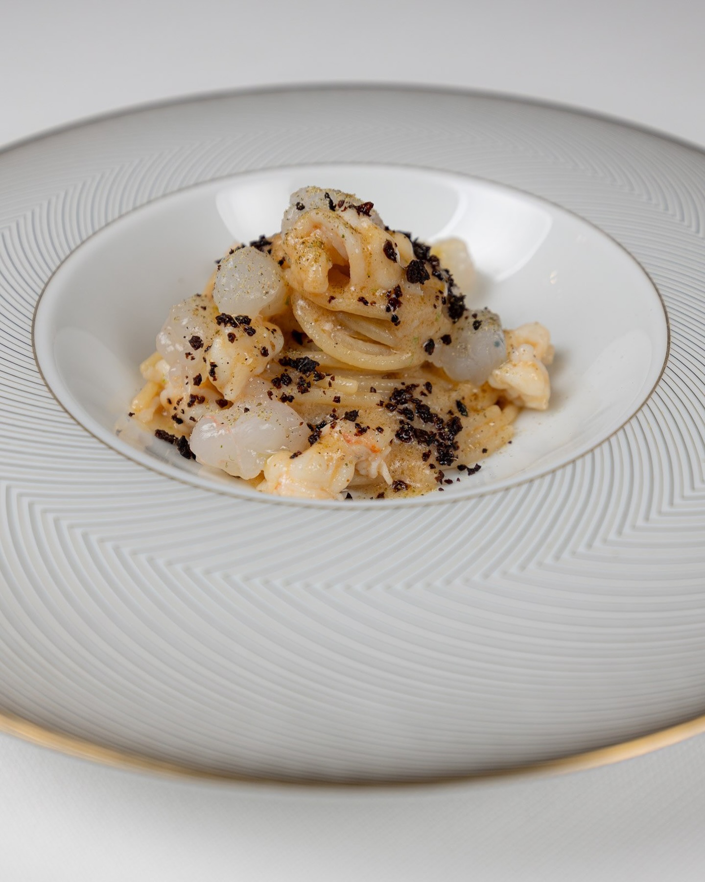 Vegetable flan, Bavette of fish, Spaghetti Versiliese, Red shrimp ravioli. -