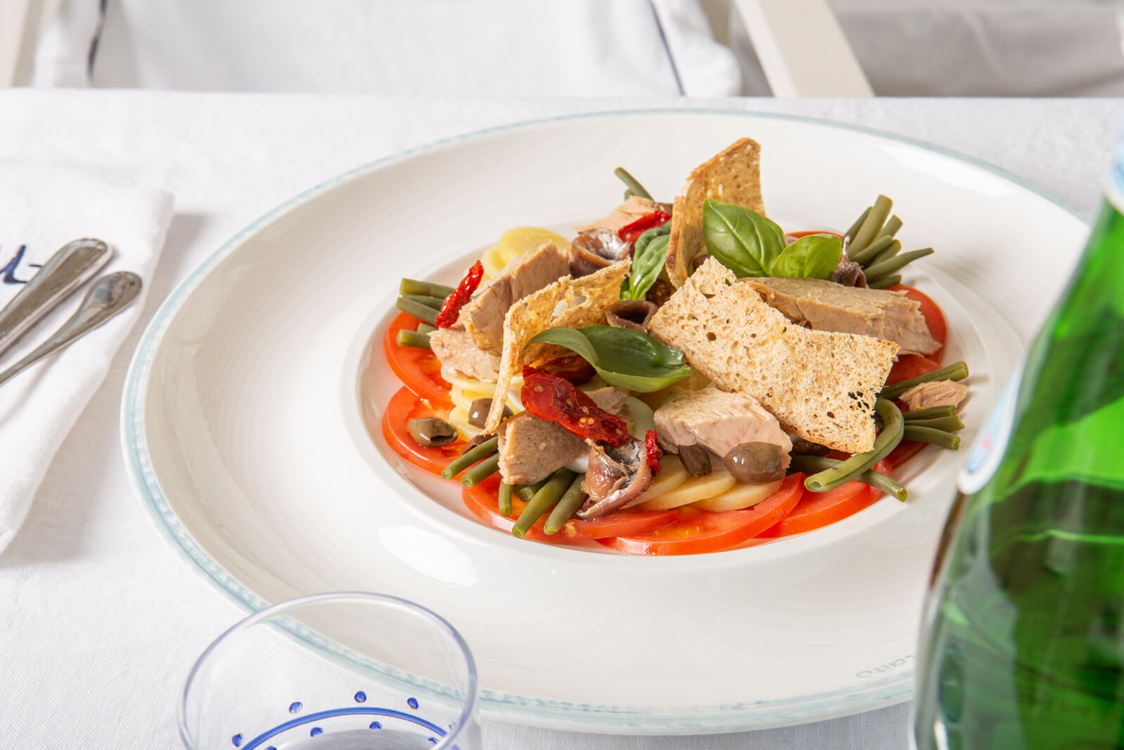 Yellowtail tartare, Fried calamari, Pizza with zucchini flowers, Classic tomato pizza, Pasta with seafood Forte dei Marmi style. -